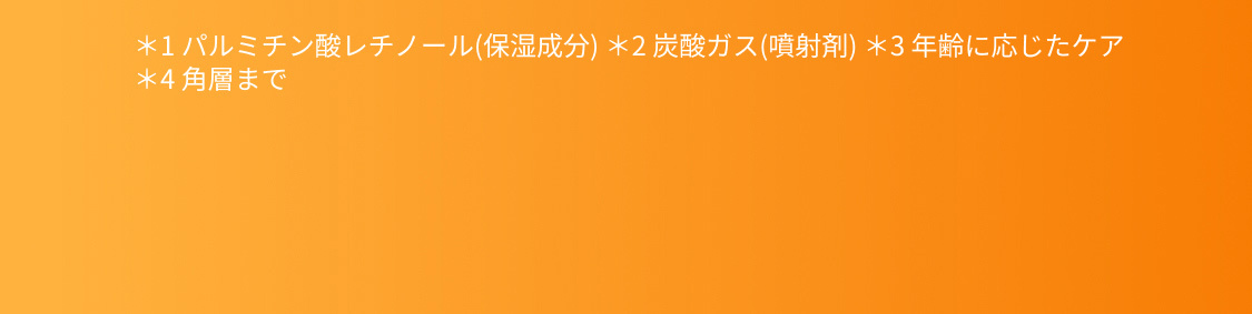 *1 パルミチン酸レチノール(保湿成分) *2 炭酸ガス(噴射剤) *3 年齢に応じたケア *4 充填時 *5 角層まで