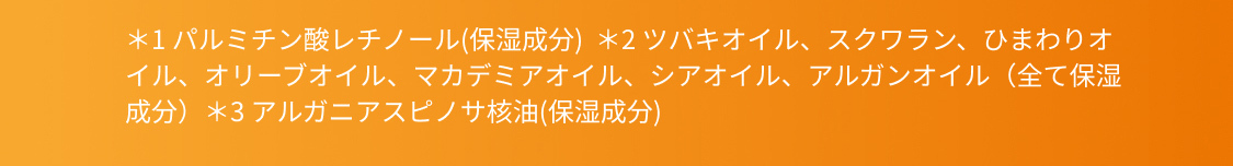 *1 パルミチン酸レチノール(保湿成分) *2 ツバキオイル、スクワラン、ひまわりオイル、オリーブオイル、マカデミアオイル、シアオイル、アルガンオイル(全て保湿成分)*3 アルガニアスピノサ核油(保湿成分)